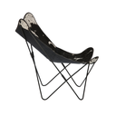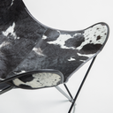Sillón mariposa con lona de piel de vaca, material natural, de color marrón. La lona desmontable, se recomiendo lavar con método profesional. Estructura hecha de acero pintado con un acabado de color Protecciones de plástico en cada una de las patas para no dañar ni rayar el suelo. Pieza que une diseño y funcionalidad a partes iguales. Además, encaja en todo tipo de ambientes, desde los más clásicos hasta los más modernos.
